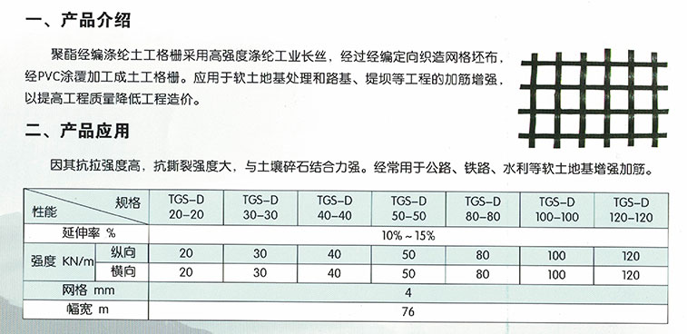 聚酯經(jīng)編滌綸土工格柵采用高強(qiáng)度滌綸工業(yè)長(zhǎng)絲,經(jīng)過(guò)經(jīng)編定向織造網(wǎng)格坯布,經(jīng)PVC涂覆加工成土工格柵。應(yīng)用于軟土地基處理和路基、堤壩等工程的加筋增強(qiáng),以提高工程質(zhì)量降低工程造價(jià)。